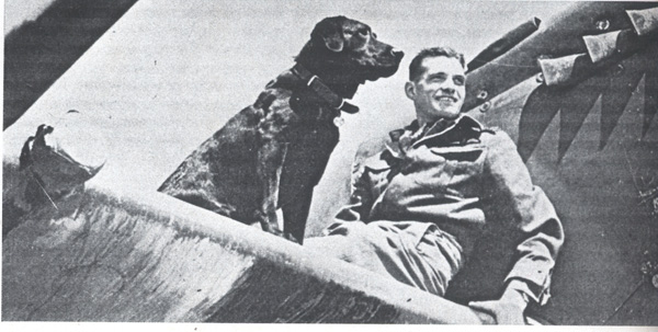 Il colonnello J.E. "Johnnie" Johnson fotografato sul suo Spitfire insieme al suo Labrador. Johnson fu il primo degli assi britannici.