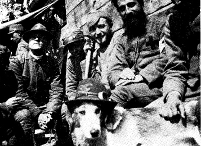 Da sinistra a destra: Il sottotenente Enrico Jahier, il sottotenente Rigamonti, un alpino e il cappellano dell'"Antelao" De Rocco di Forno Canale. Il cane Garian porta il cappello alpino in seguito alla sua nomina a "penne nera" ad honorem dopo essere stato ferito nell'attacco al Masarè.