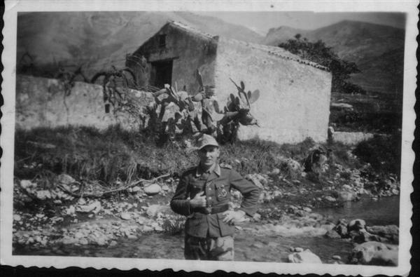 Ora posto la foto di un Oberfeldwebel della Wehrmacht, sullo sfondo si vede la catena montuosa dei monti Aurunci con il monte Fammera e Petrella, di fronte a lui c`è il Fiume Garigliano che delimita la Linea Gustav. Il graduato con berretto tropicale e pantaloni in tessuto italico sfoggia anche una inconsueta (al fronte) decorazione, la reiterabzeichen, a voi i commenti.