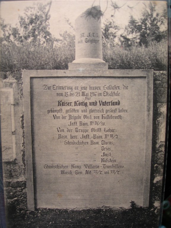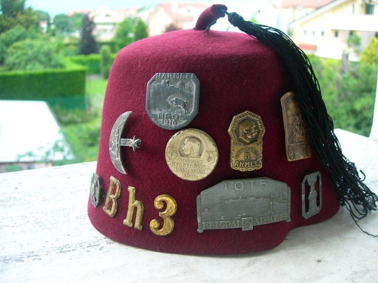 Ora volevo aprire una parentesi che spero possa essere di ugual interesse e che possa avere un seguito con i Vostri pezzi : i Fez bosniaci. Il berretto che posto di seguito è del BH3, il terzo reggimento della Bosnia Erzegoniva. Come tutti i reggimenti bosniaci i vari battaglioni erano dislocati in varie brigate/divisioni e durante il conflitto erano frequenti gli spostamenti. Il III/BH3 (terzo battaglione) era inquadrato nella 57^ divisione che operò nel territorio Italiano (Carso con Isonzo Armee, Straexpedition con 11^ Armee, Piave con la nuova sesta armata). Si noti la cartolina seguente che indica un monumento con le insegne dei reggimenti della 57^ all' epoca della Strafexpedition :
