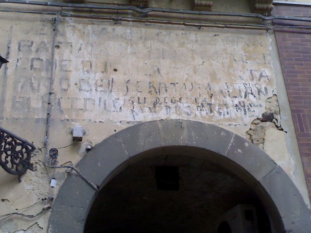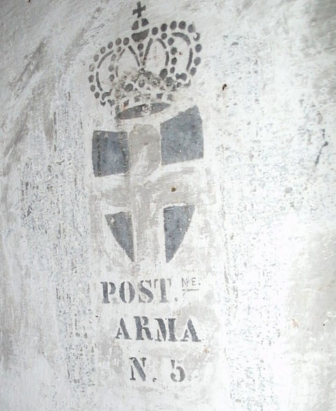"La vita dei rischi continui lega le anime". Sopra c'e' la stemma reale italiana, e c'erano anche i due fasci. Visto che la stemma e la scritta sono sopravissute, ritengo che i fasci erano cancellati gia' durante la guerra, dal guarnigione italiano stesso, cioe' dopo la caduta di Mussolini...