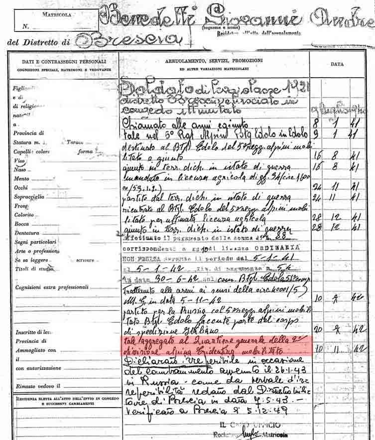 I miei dubbi sono sostanzialmente legati alla motivazione della MAVM, all'assenza del luogo e della data di conferimento e al fatto che risulta disperso dopo il combattimento del 26 gennaio 1943 (Battaglia di Nikolajewka); tutto questo perchè chi mi ha chiesto info mi ha detto che le sue ultime notizie risalgono al 17 gennaio 1943.