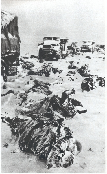 Non si trattava né di una colonna, né di sole due nazionalità*, ma di un confuso andare di piccoli e grandi gruppi strettamente frammisti intersecatisi, di nuovo separati e di nuovo riuniti dalle vicende della marcia a seconda delle isbe disponibili per passarvi la notte, degli attacchi sovietici da nord e da sud, degli ordini e contrordini che, magari vecchi di qualche giorno raggiungevano questo o quel reparto ancora relativamente uniti.