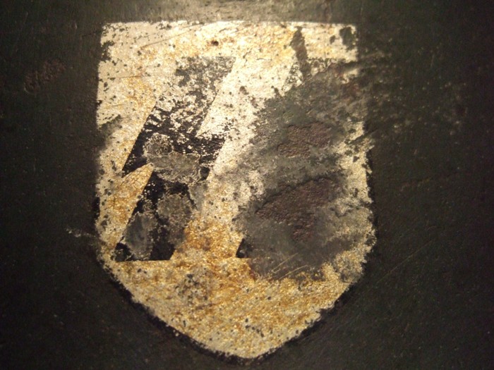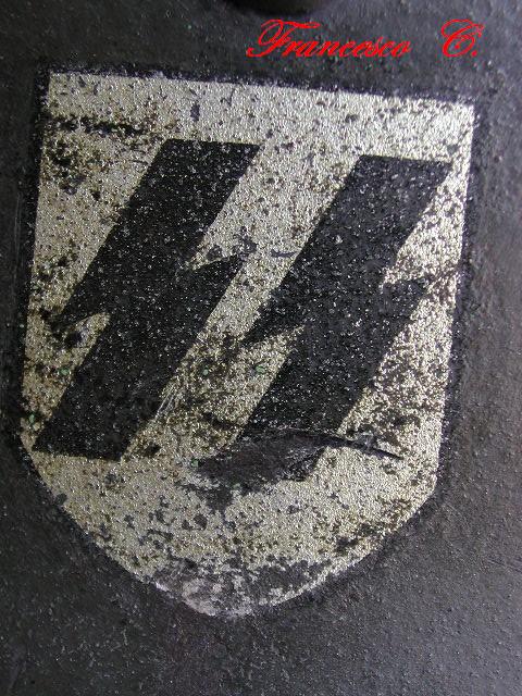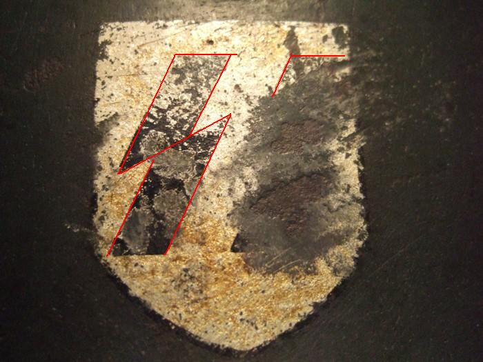 - l'abrasione della runa di destra è stata provocata appositamente e ciò lo si denota dal fatto che la stessa abrasione non si riscontra sulla parte di elmo e vernice a fianco;