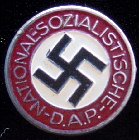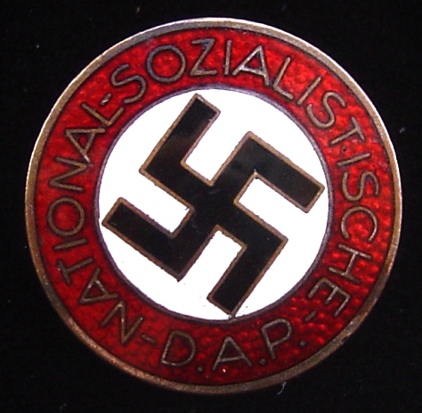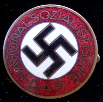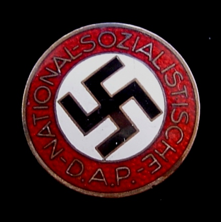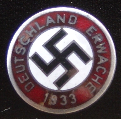 Realizzato in lega metallica smaltata presenta sul fronte una svastica nera filettata d'oro in campo bianco, circondata dalla scritta in lettere maiuscole dorate su fondo rosso "NUN ERST RECHT!" (ORA PIU` CHE MAI!). Si tratta di un motto usato per chiamare a raccolta e compattare i simpatizzanti del N.S.D.A.P. in un momento in cui le sorti del partito erano in bilico ed il numero degli iscritti diminuiva anzicche' crescere, grazie all'azione di von Papen e alla ripresa economica in atto.