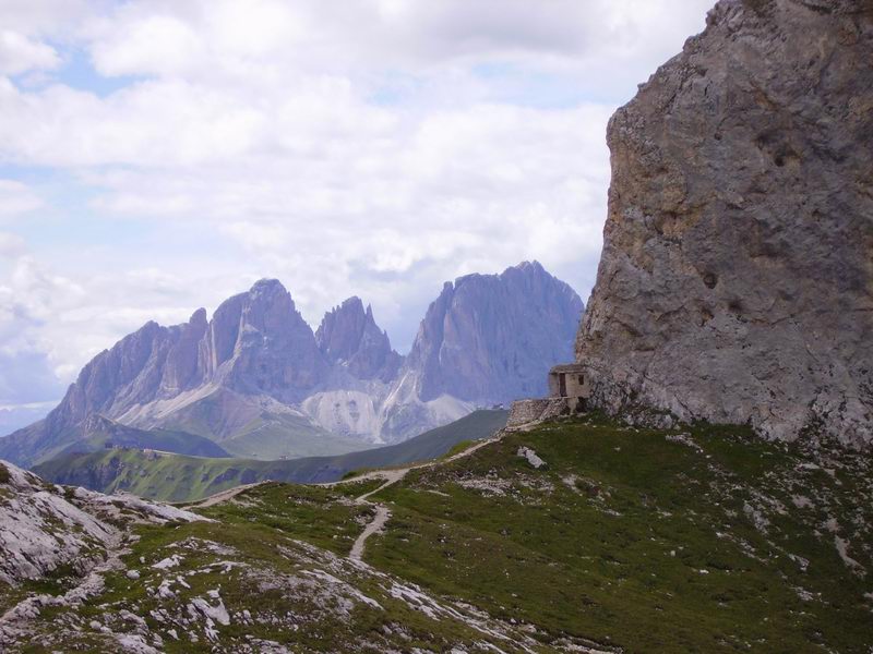 Riguardando la foto delle tre cime, mi sembra che siano troppo vicine per essere nel punto che dicevo io, direi più zona Monte Piana, anche se quella costruzione nella forcella e quello sperone di roccia non mi ricordano niente.....[:(]