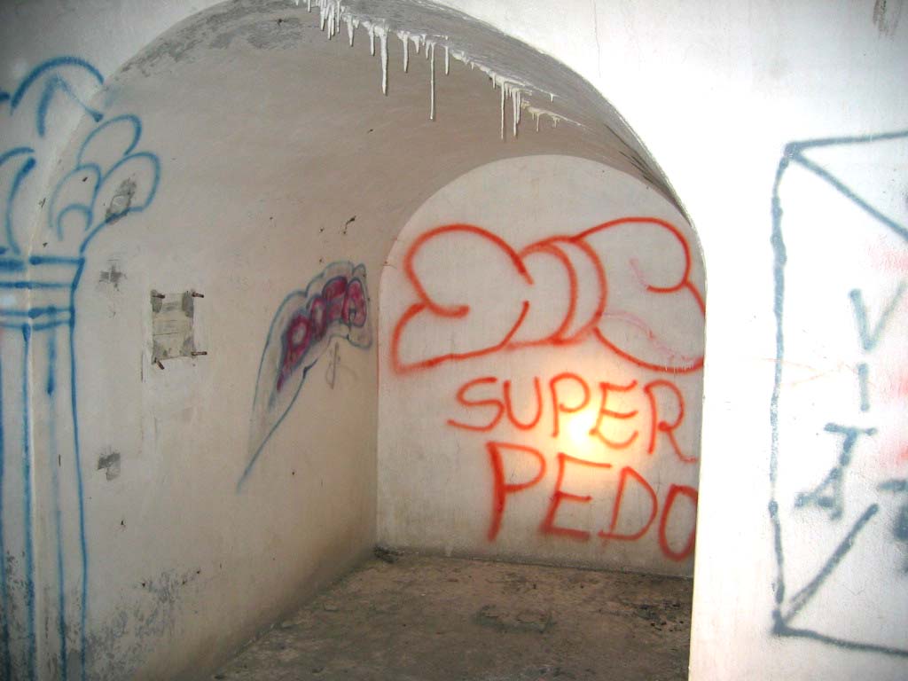 Anche al forte bramafam abbiamo trovato varie scritte, anzi continuiamo ad averne nelle gallerie da restaurare, sono le solite cavolate che si scrivono anche nei bagni delle scuole. questo tale però è uno che scarabocchia qualsiasi cosa gli passi davanti! Alcune opere della valle rho sono scritte in decine di punti! Purtroppo non sarà* mai possibile beccarlo in fragrante, ma spero che guardando tale discussione capisca del suo atto di vandalismo e che si risenta di quello che ha fatto e che continua a fare!