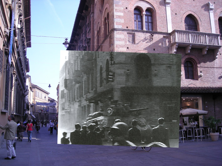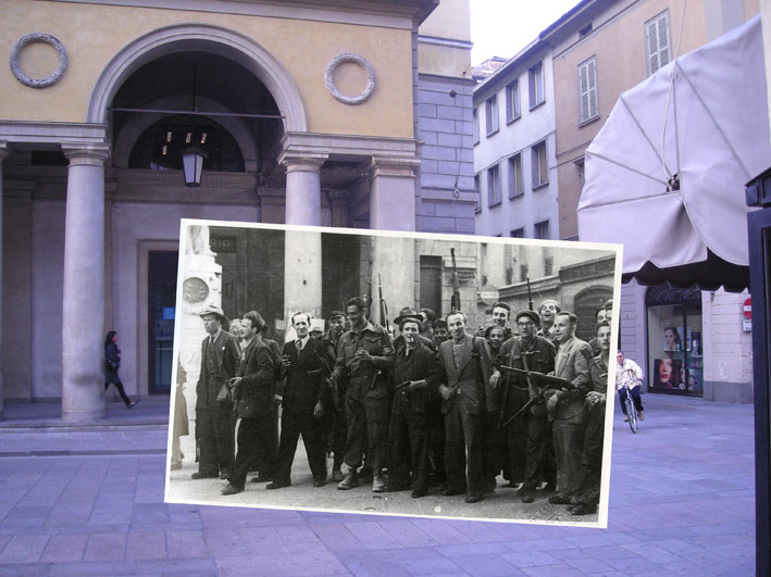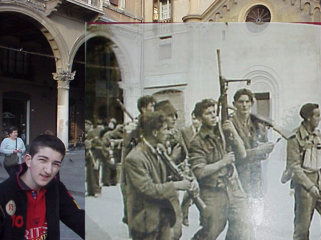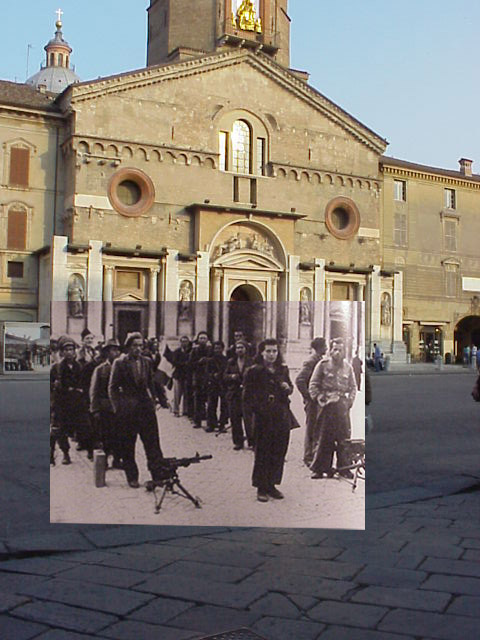 adesso che ci penso...dovrebbero esserci delle immagini, riprese qualche tempo prima nella stessa piazza, ma quelli che sfilavano non erano partigiani, bensì una famosissima unità* ss....scommetto che Micky ha anche queste.....