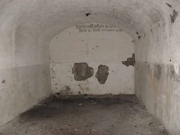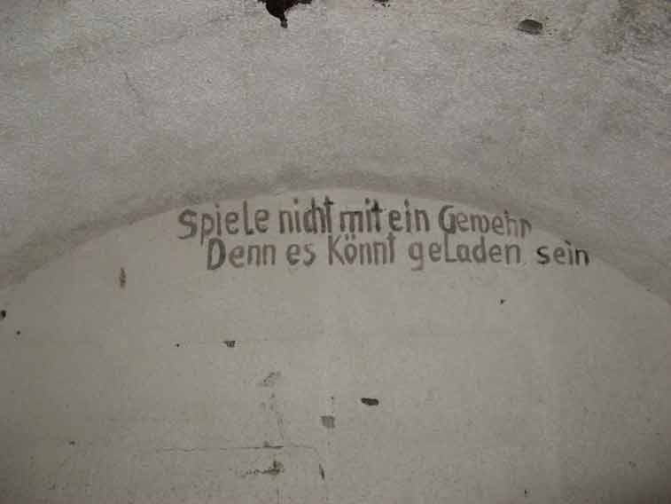 Sulla parete S del ricovero è ancora presente una scritta in Tedesco che recita "Spiele nicht mit ein Gewehr,denn es konnt geladen sein" che tradotto dovrebbe significare "Non giocare con un fucile perché potrebbe essere carico"