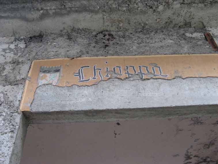Un`insegna con la scritta CHIAPPA e a fianco uno scudetto che assomiglia ad uno stemma araldico è presente sopra lo stipite di una porta,non ne conosco il significato.Posso solo aggiungere che nei pressi è presente un promontorio roccioso denominato Punta Chiappa.