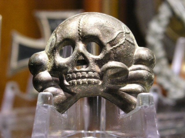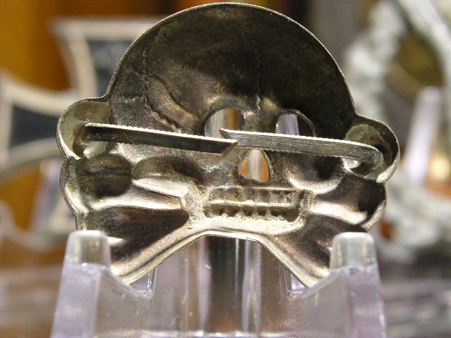 Questo dovrebbe essere un Totenkopf da Kepì delle Stosstrupp, prima componente delle SS, risalente agli anni venti e primi trenta, le Stosstrupp si distinguevano dalle SA per i pantaloni, la cravatta e il Kepì nero, recante appunto il Totenkopf sotto l'adler del partito, le Stosstrupp si distinguevano anche perchè il bracciale con l'Hakenkreuz portava due bande nere ai bordi.