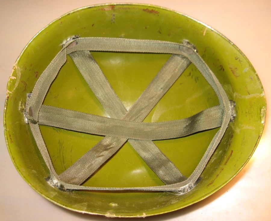 Il liner ha un webbing fantasia, che ricorda quello vietnam senza esserlo. Nella prima versione il web e' ancorato con delle rondelle a forma di A (come gia' per i liner ww2) mentre nell'ultimo tipo le rondelle sono rettangolari e sganciabili. Nel nostro caso nessuna delle soluzioni va bene, sembra che il cinghiame sia stato rivettato in modo del tutto particolare. La fascia centrale, quella che va dalla nuca alla fronte per intenderci, ha un "manicotto" entro il quale passano le altre due, che nel nostro caso non vedo. Infine il liner non ha ganci per nape strap o altro. Insomma, per me e' un modello mai visto prima, dubito perfino sia USA.