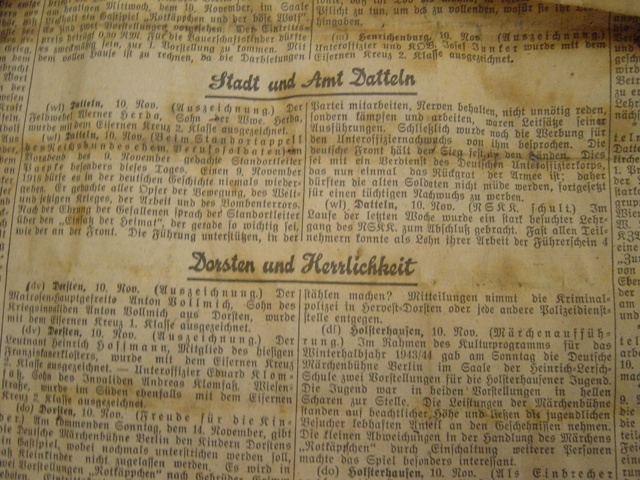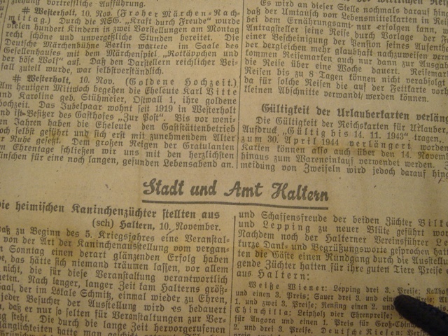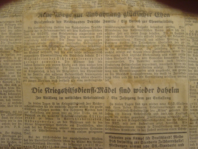 Bel berretto, complimenti! Direi che l'aquila poi fa al caso suo. Davvero particolare il giornale, a quanto sembra, uno degli ultimi fogli di un quotidiano locale, infatti ci sono pubblicità* e annunci (lo schirmmutze taglia 55 per 10 marchi!!)