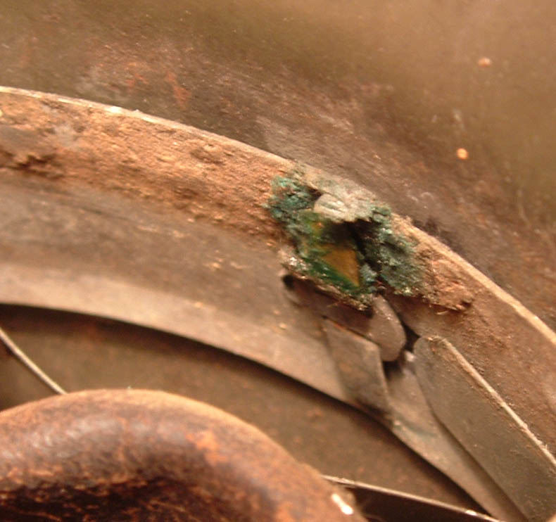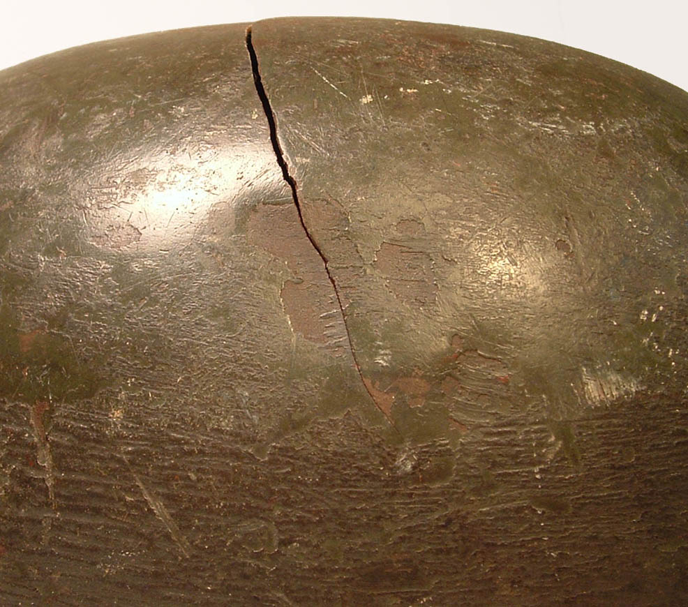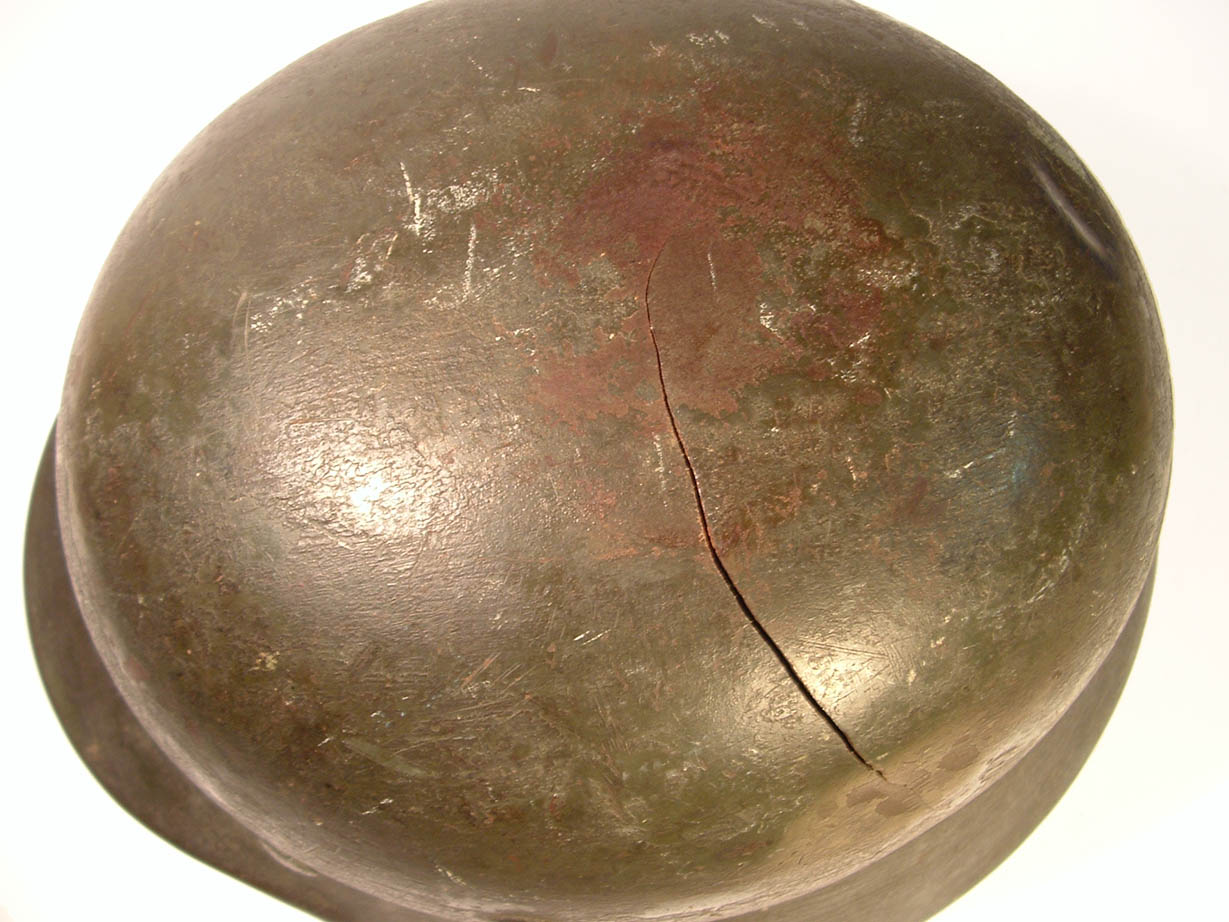 Non si vede il particolare della crepa sulla calotta, dal sopra; in casi del genere almeno la vernice camo dovrebbe essere piuttosto scrostata e saltata, quale che sia il motivo dell'urto, anche perchè mi sembra di vedere delle bozze sul lato sinistro.