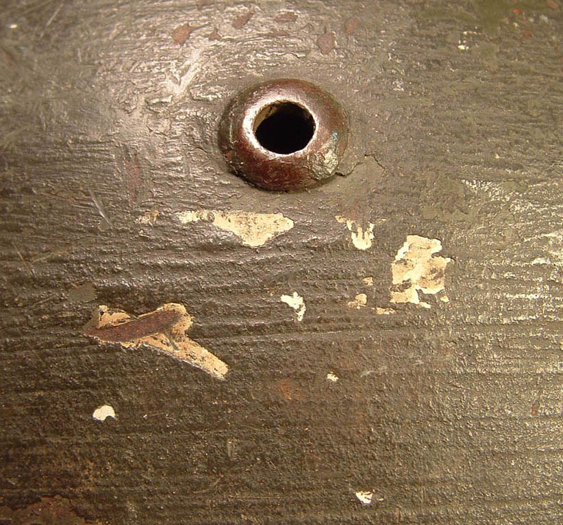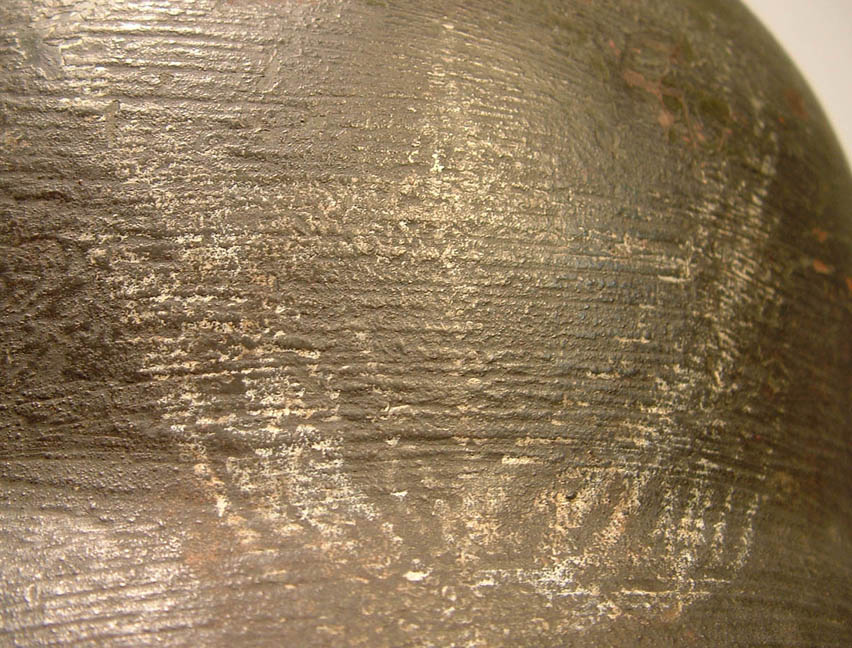 ehi Piesse l'elmo l'ho gia postato qui nel forum, farò una foto dettagliata della frattura nella calotta che comunque risulta molto usurata e dove la vernice usata per mimetizzarlo è andata via quasi tutta , come detto la decal heer è effettivamente applicata sopra il mimetismo, la decal come quel simbolo bianco si conserva solo sulla traccia delle pennellata in "negativo" che quindi non è nel punto di usura o contatto, per quanto rigurda le decal sotto non so cosa siamo se heer o polizia o ss perchè è rimasto solo il fondo di entrambe, bisognerebbe grattare la vernice per capire che in parte è stato fatto da chi lo possedeva prima con il risultato che si vede