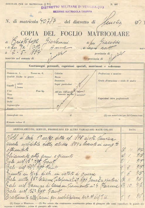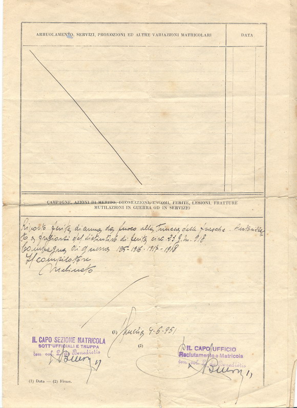 h) Assume il grado di Caporale per anzianità* di servizio (mi è stato detto e confermato che poco prima della fine della guerra diventò cp.magg., ma purtroppo questo non c`è da nessuna parte)