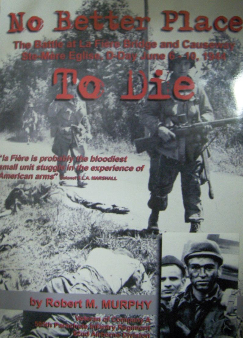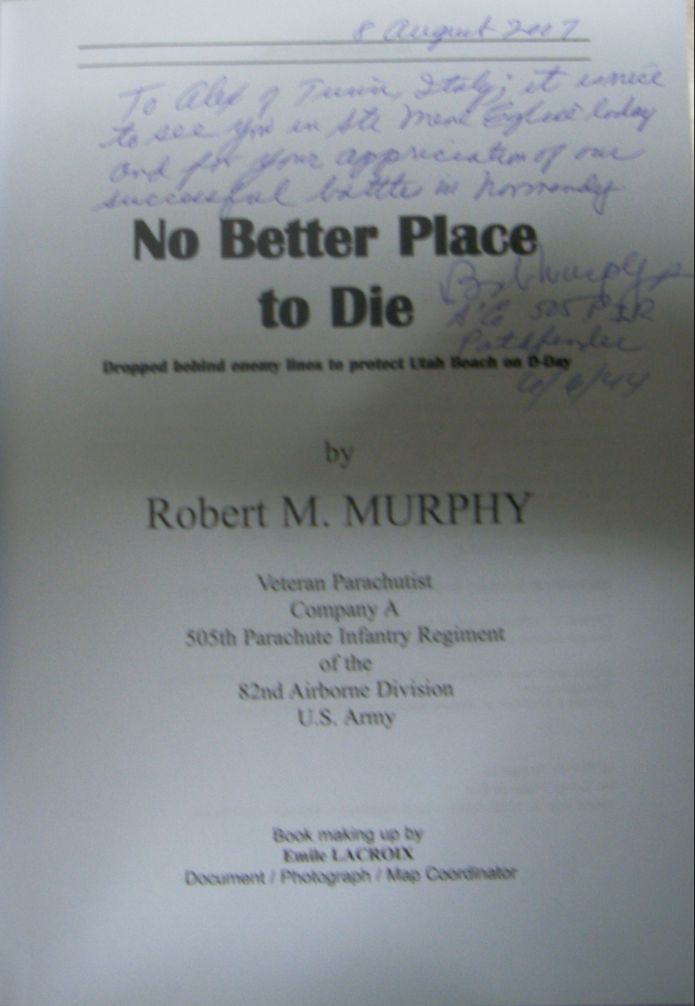 Il libro,"No Better Place To Die"(Nessun posto migliore per morire)parla dell'esperienza di Bob in Normandia e spiega inoltre dettagliatamente ciò che fece la sua divisione prestando attenzione in particolare modo a diversi soldati ed ufficiali che componevano l'organico di questa storica unità*.Il libro è composto di 245 pagine ed è pieno di fotografie d'epoca(oltre a quelle di commemorazioni che vanno dagli Anni Sessanta ad oggi),oltre ovviamente a mappe ed a schizzi fatti a mano.Il libro lo si può acquistare sia in Inglese sia in Francese(tradotto ottimamente dal Signor Emile Lacroix)ed assicuro che è una spesa che merita di essere fatta perchè questo libro merita di essere letto e riletto e riletto e riletto.Davvero avvincente,ma soprattutto un libro che senti che è VERO dalla prima all'ultima pagina(e scusatemi se è poco!!!).Credo che tutti dovrebbero leggerlo almeno una volta,ed è sicuramente un must have per coloro che sono appassionati delle truppe aviotrasportate e della Normandia come me.Consigliatissimo.