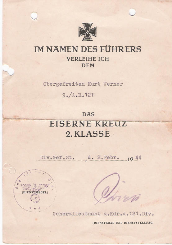 La guerra prosegue,ed ai primi di Gennaio del 45,con la Wehrmacht oramai quasi allo sbando,riceve l'attesto per la decorazione in classe Argento,non prima di esser stato promosso a O.Gefreiter: