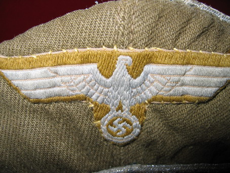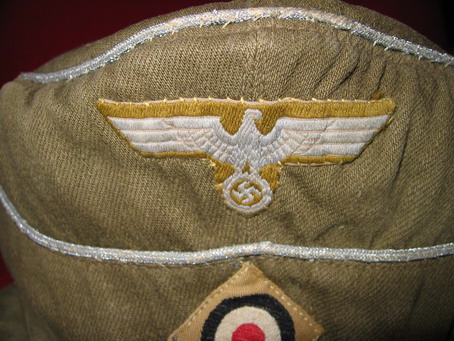 vorrei permettermi di dire le mie impressioni sul cappello Afrika che hai postato; posso assicurare con pochissimo margine di errore, il rimontaggio del piping argentato e dell'aquila; entrambe sono infatti cuciti a mano con lo stesso filo cosa impensabile per un cappellino del genere la quale aquila veniva abitualmente cucita in fabbrica (solitamente a macchina, ma anche a mano) ed il piping argentato a mano dall'ufficiale in questione (o chi per lui). Onestamente, avanzerei qualche dubbio anche sull'autenticità* della coccarda.