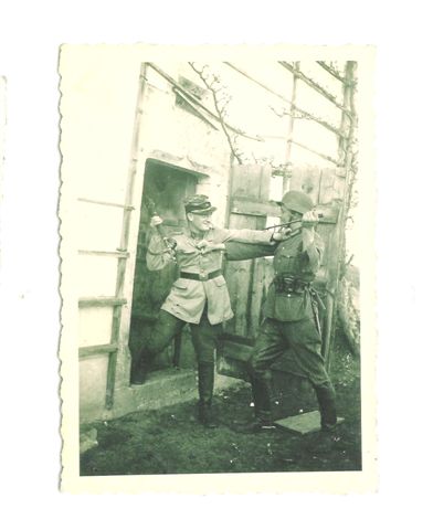 Indossata giubba e kepi, il commilitone si presta a fare il "nemico" per una foto spiritosa.[]