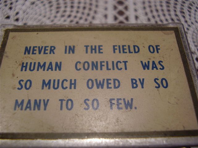Ma la mia domanda è questa:secondo voi non potrebbe essere un oggetto del primo dopoguerra acquistato da qualche veterano?Il fatto che vi sia impressa la storica frase di Churchill mi fa pensare che questo manufatto sia postbellico.Allora,fino al 1940 mi pare che come premier ci fosse Neville Chamberlain,così Churchill è subentrato mettiamo da metà* del 1940 in poi(sul periodo preciso non sono documentato),quindi,possibile che in guerra si trovasse il tempo per creare un oggettino del genere?Consideriamo inoltre che l'Inghilterra non è che navigasse nell'oro dopo l'Operazione Leone Marino(tentativo di sbarco che si sarebbe in teoria dovuto verificare quando l'Isola di Albione avrebbe ceduto dopo gli incessanti bombardamenti)dei Tedeschi.