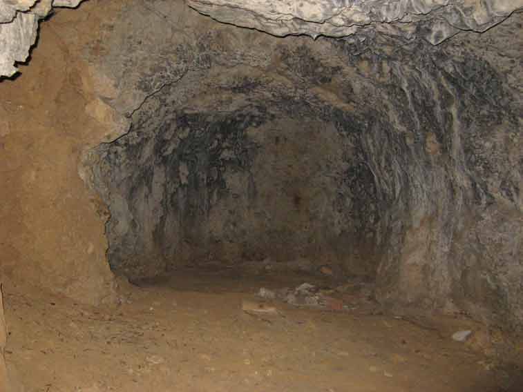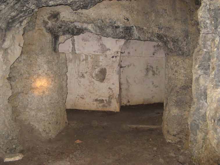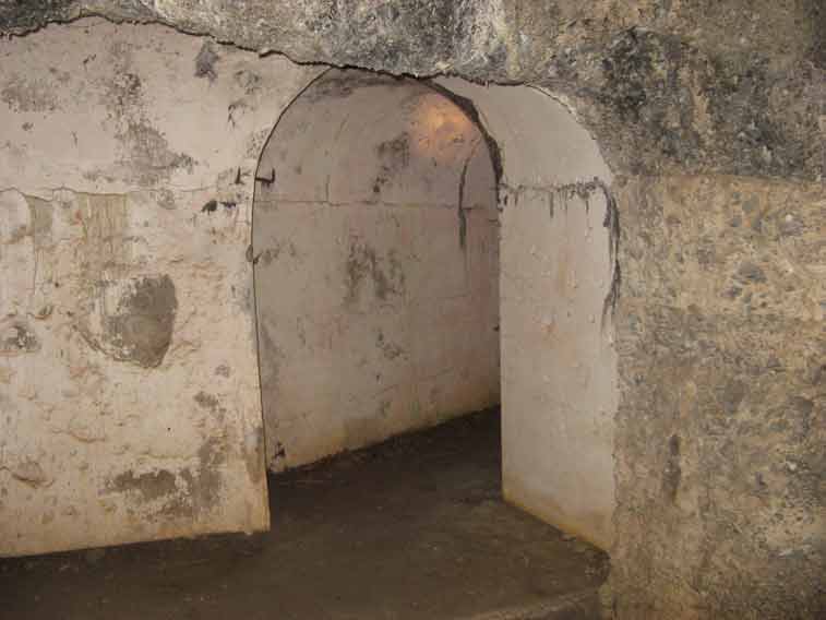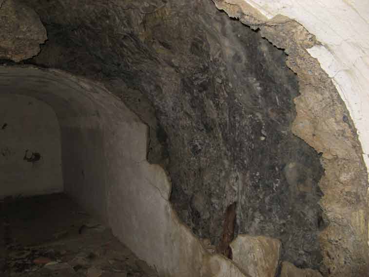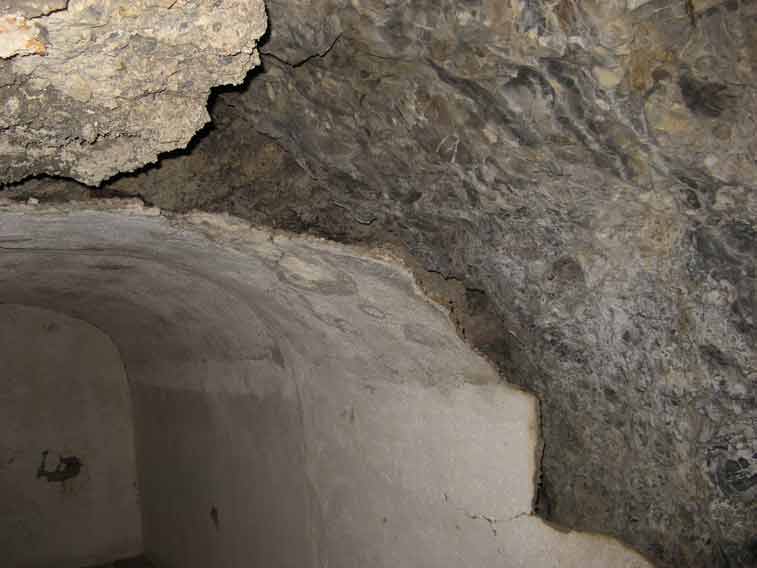 Curioso il sistema di isolamento dei locali e tunnel in caverna,dopo aver rivestito con l`intonaco la roccia veniva gettato uno strato di erba(o paglia) mista a cemento e successivamente uno strato di mattoni ed intonaco.Questo sistema è visibile nei tratti di parete crollati.