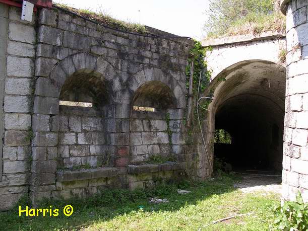 Interno della cinta muraria a sinistra del portone con le feritoie (notare il gradino di combattimento) e l`entrata della galleria di sinistra.