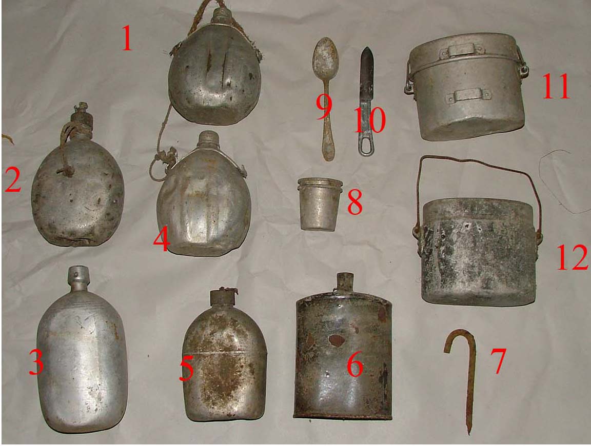 La borraccia n.3 sembrerebbe proprio una borraccia belga in alluminio da un litro sempre della prima guerra, originariamente era rivestita di panno nero; quella belga che dico io è leggermente più stondata ma il collo è il suo. (Per chi volesse confrontarla con il libro "Per non morir di sete" la borraccia in questione è a pagina 29 figura/didascalia n.9)
