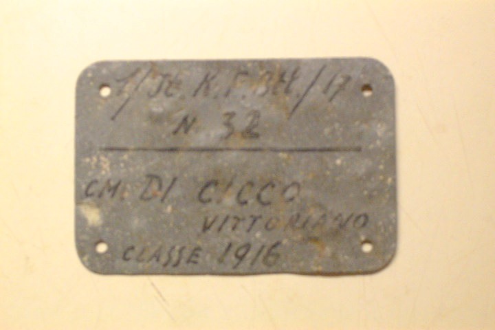 Posto questo piastrino di riconoscimento italiano in lamierino di zinco, ritrovato sul Carso sloveno, dovrebbe essere a rigor di logica utilizzato in periodo RSI ma nulla vieta che si tratti di un soldato italiano inquadrato in un reparto tedesco la parte anteriore è così scritta a inchiostro indelebile, sul retro non appaiono scritte in quanto tale tipo di piastrino similmente ai prima guerra venivano cuciti all' inerno della giacca:
