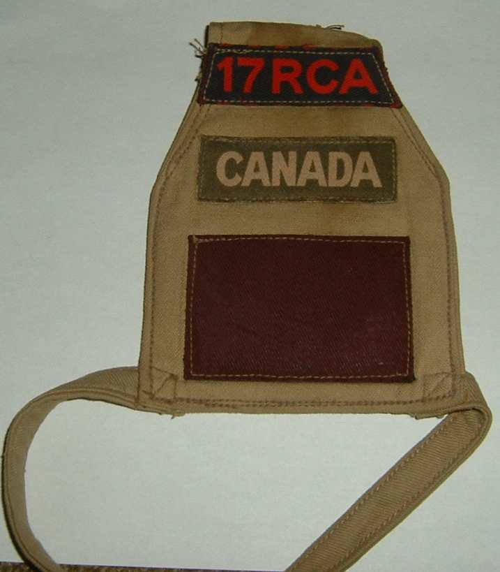 Armlet per un capitano del 17 Field Regiment della Royal Canadian Artillery, 5th Armoured Division. Tilte stampato su tela, title di nazionalità* stampato su tela, e insegna divisionale nel colore amaranto dalla 5a. Diffreirsca da quello precedente per la presenza di una controspallina che va a sovrapporsi a quella della KD tunic (nella foto è ripiegata dietro l'armlet) dove sono bene presenti le tracce lasciate da tre "pips" ricamati, e poi rimossi.