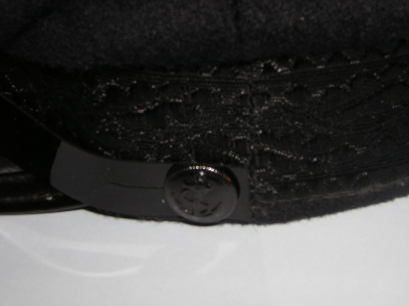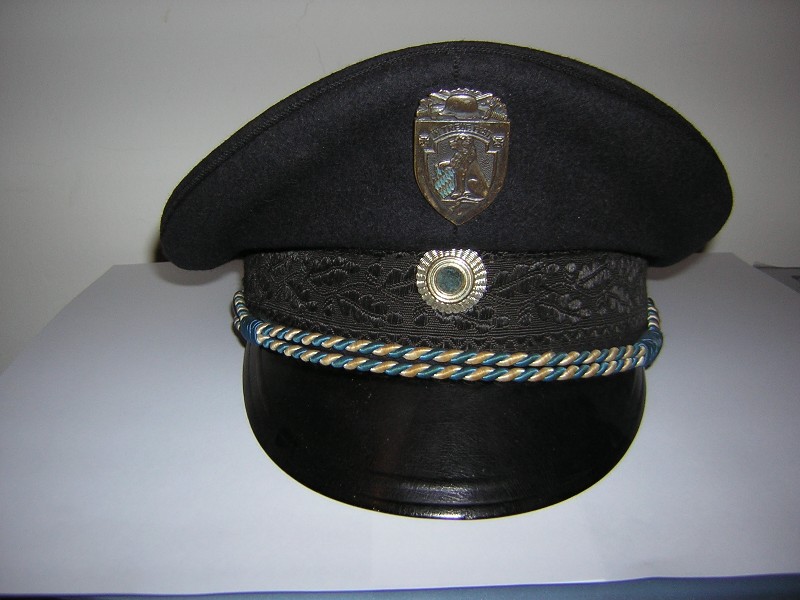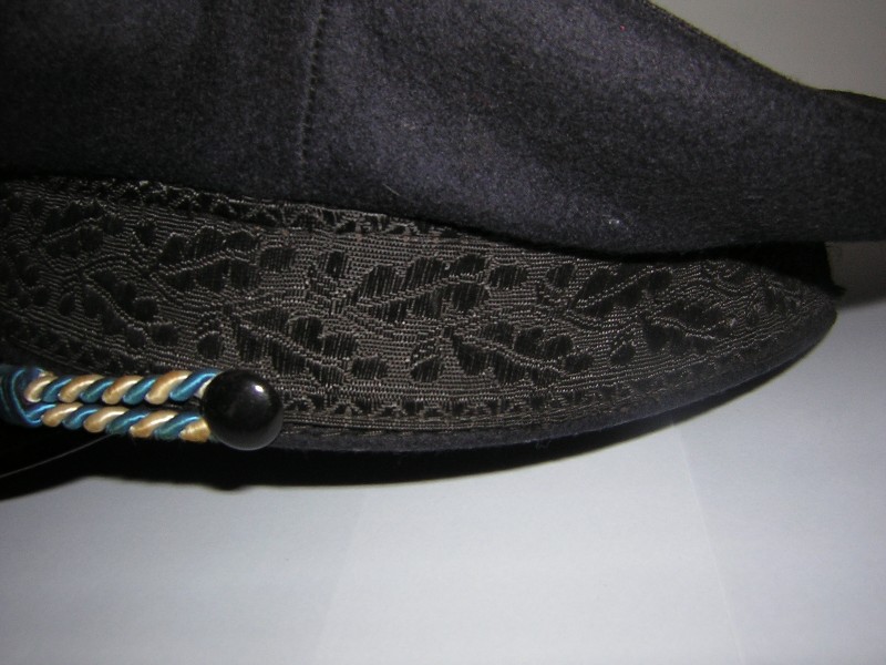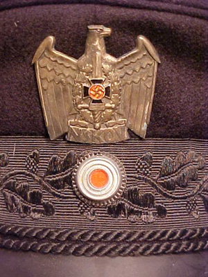 ho per le mani questo schirmmuetze ed ho qualche difficoltà* ad identificarlo correttamente essendo privo delle proprie insegne metalliche. lana blu scurissimo/nero,difficile stabilirlo (a me pare di più nero), banda nera tipo mohair ricamata a macchina con motivo di foglie di quercia e ghiande. visore con bordo riportato (tipo luftwaffe) a doppia cucitura. sui lati, bottoncini in argento tipo ufficiale. un cappello molto simile sarebbe quello del d.a.f., ma dal mio archivio mi pare essere un blu scuro diverso dal mio e la banda non ha quella specie di "greca" a zigzag sopra e sotto qui presente(senza contare che quello d.a.f. avrebbe al suo interno l'etichetta nsdap, cosa che questo non ha) sul frontale ci sono i buchi lasciati da un'insegna metallica sulla banda, ma apparentemente nessuno segno sulla parte alta del cappello.