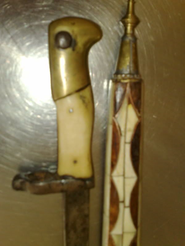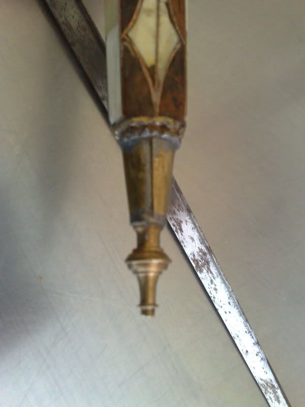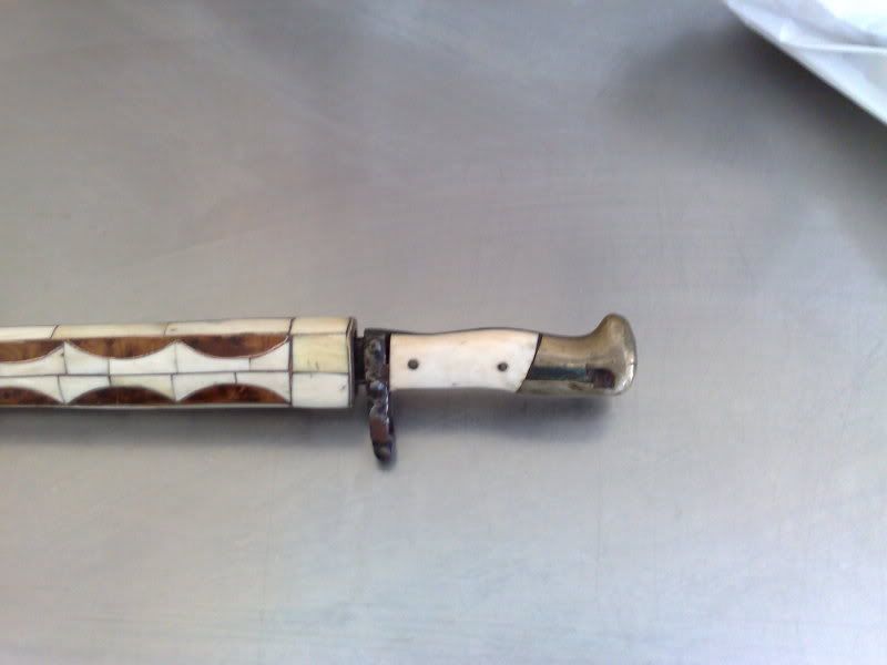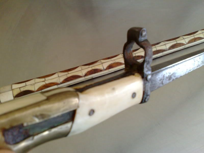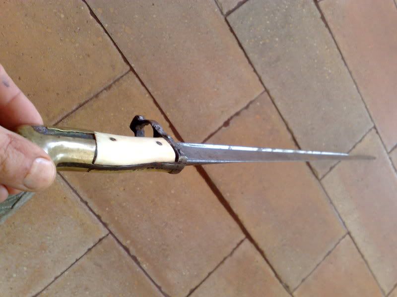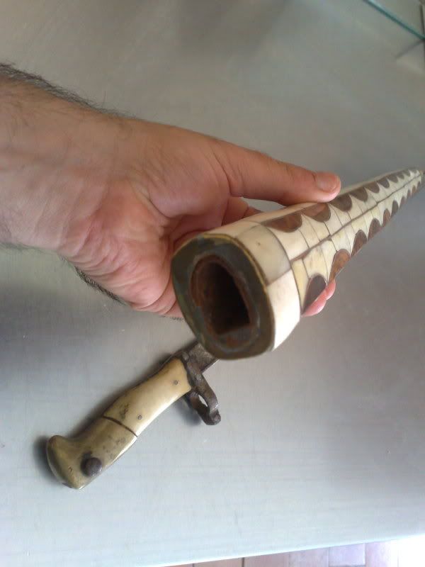 salve ragazzi..ho bisogno di un aiuto..mi hanno portato questa sciabola davvero strana e non capisco cosa sia...ha una scritta che non si legge bene nella lama sembra scritta in francese...la custodia sembra in osso e il manico sembra a becco d acquila...forse č qualcosa di artigianale su una base di sciabola esistente...sapete aiutarmi grazie