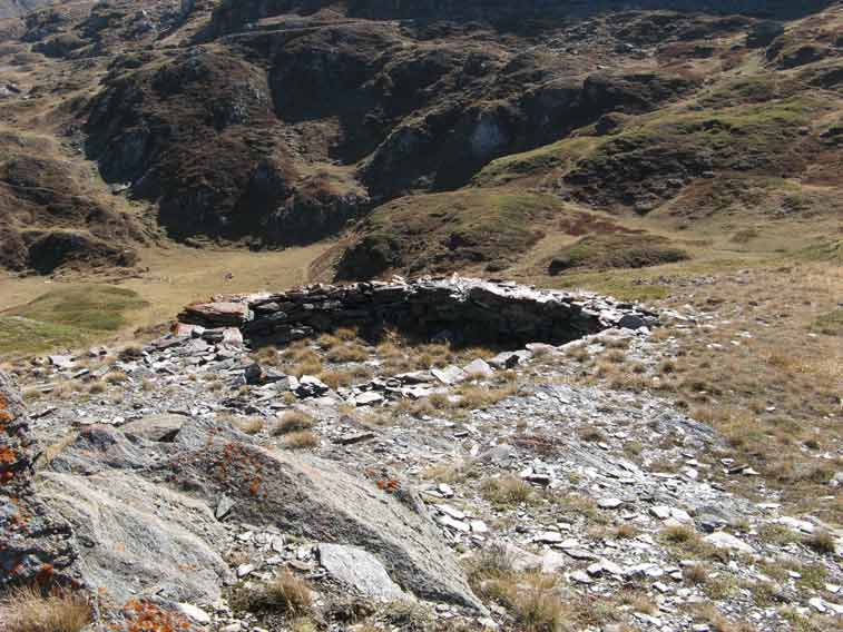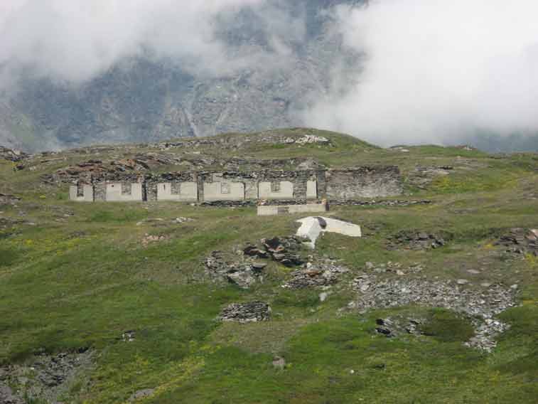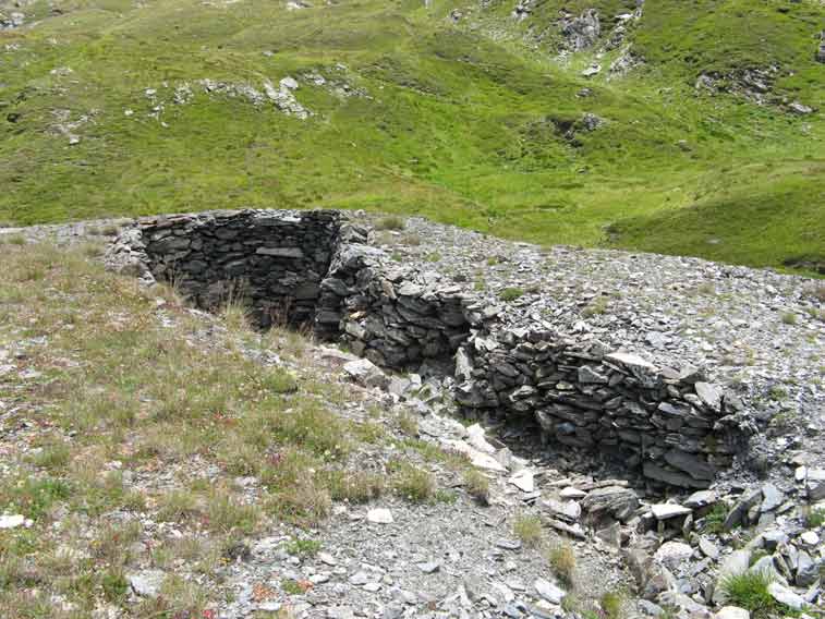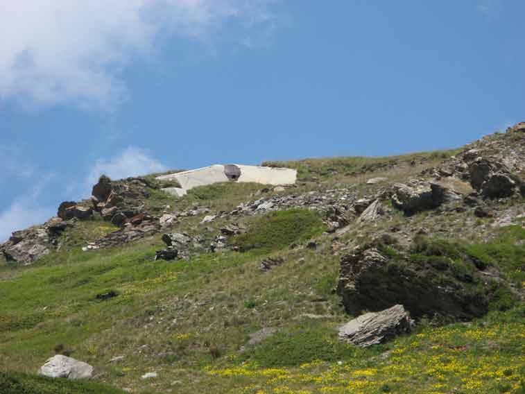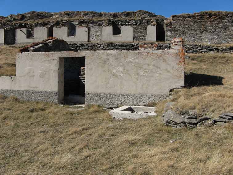 La casamatta A2 con campo di tiro il vallone verso il Varisello.Sullo sfondo i resti dei fabbricati della batteria Pattacroce bassa