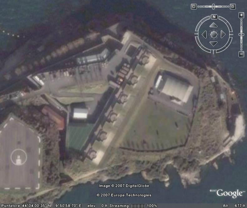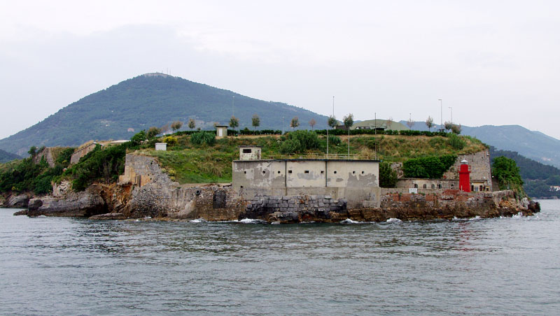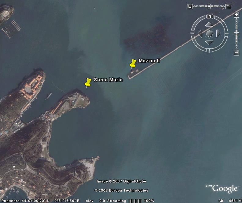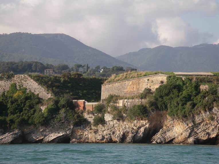 Cominciamo con la solita immagine satellitare per localizzarlo sull`omonima punta che, con l`estremità* occidentale della diga foranea (dove sorgono la batteria Mazzuoli ed il fanale verde d`entrata) delimita il varco di ponente del porto della Spezia