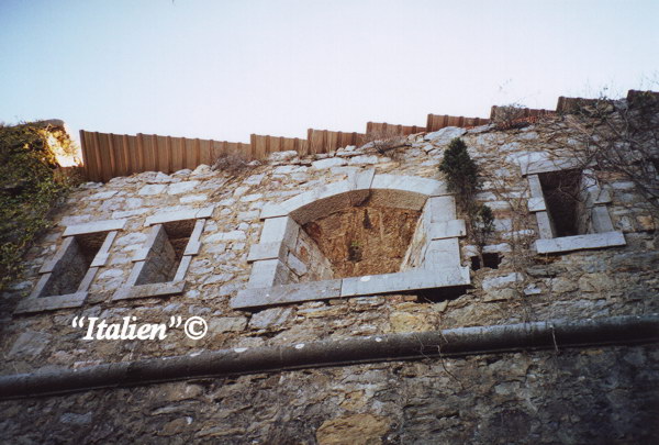 Un po` più a sinistra: una serie di feritoie dominanti la rampa che conduce al portone di ingresso.