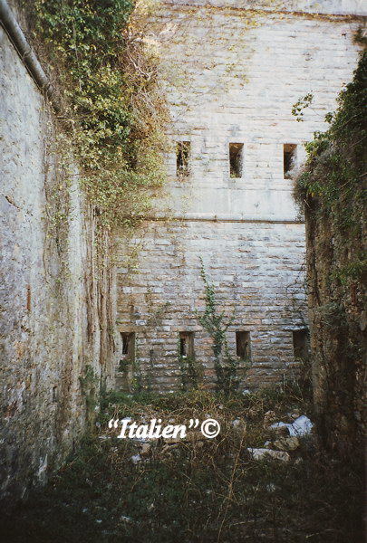 Particolare della struttura di ingresso del forte (stavolta si procede in senso antiorario). Il fossato settentrionale è sempre lì.