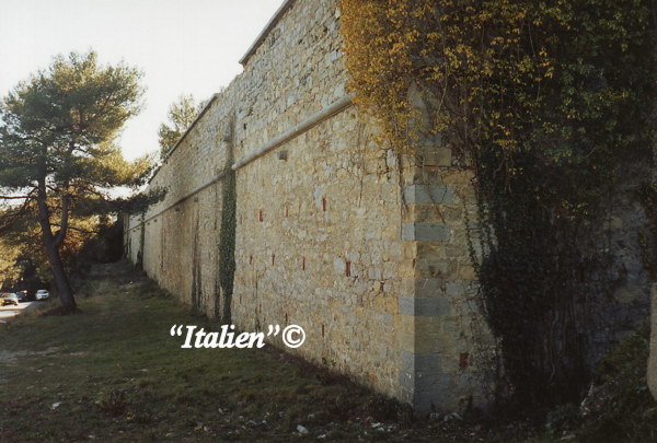 Continuando a girare in senso antiorario e superato l`altro ingresso del fossato settentrionale (in questa immagine è proprio nel macchione che si vede in basso a sinistra), troviamo il muraglione del lato Ovest.