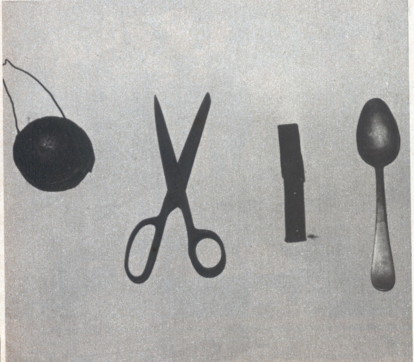 Una lucerna costruita dal giapponese, le sue forbici, una lama e un cucchiaio