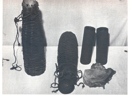 Cesti di vimini intrecciati "a mano" da Yokoi a forma lunga e stretta per catturare i pesci e a destra due contenitori in legno e uno strofinaccio ottenuto con della carta compressa.