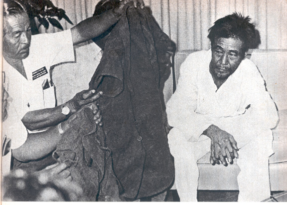Shoighi Yokoi al rientro nel mondo civile.Quando venne catturato da due pescatori viveva completamente solo ormai da otto anni.