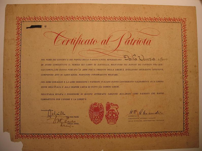 Questo diploma mio nonno lo ricevette dal generale Alexander il giorno dei festeggiamenti per la Liberazione in piazza S. Marco a Venezia.