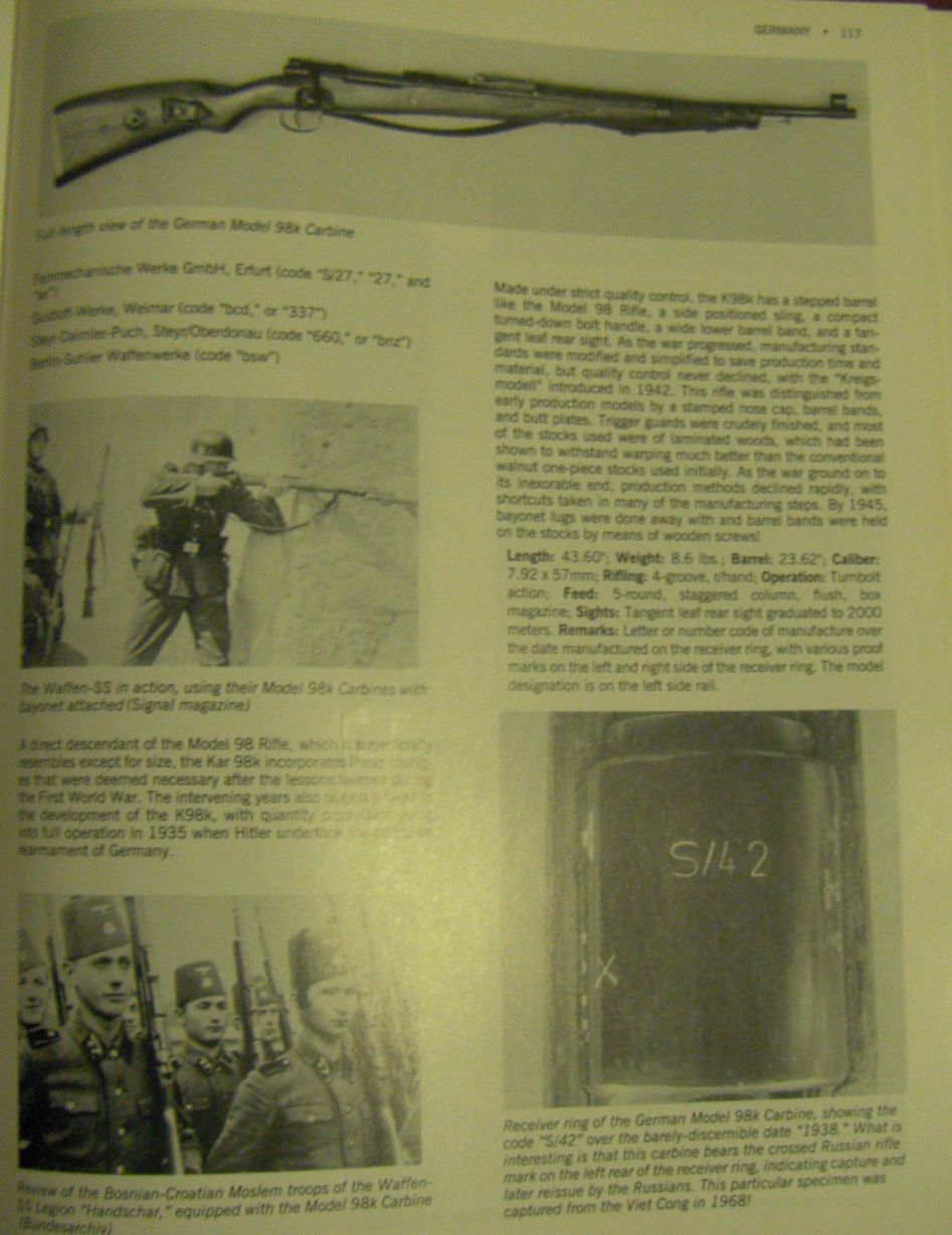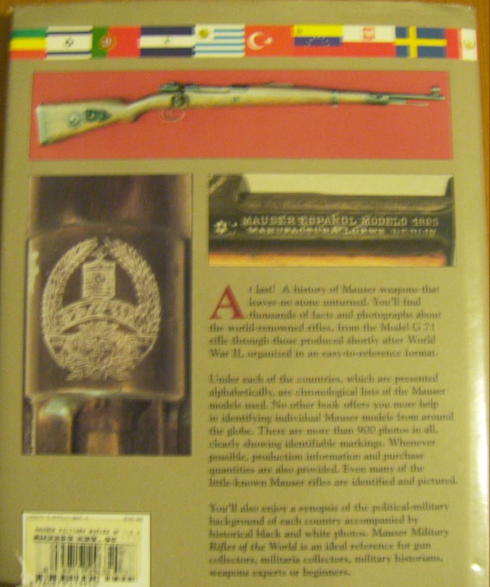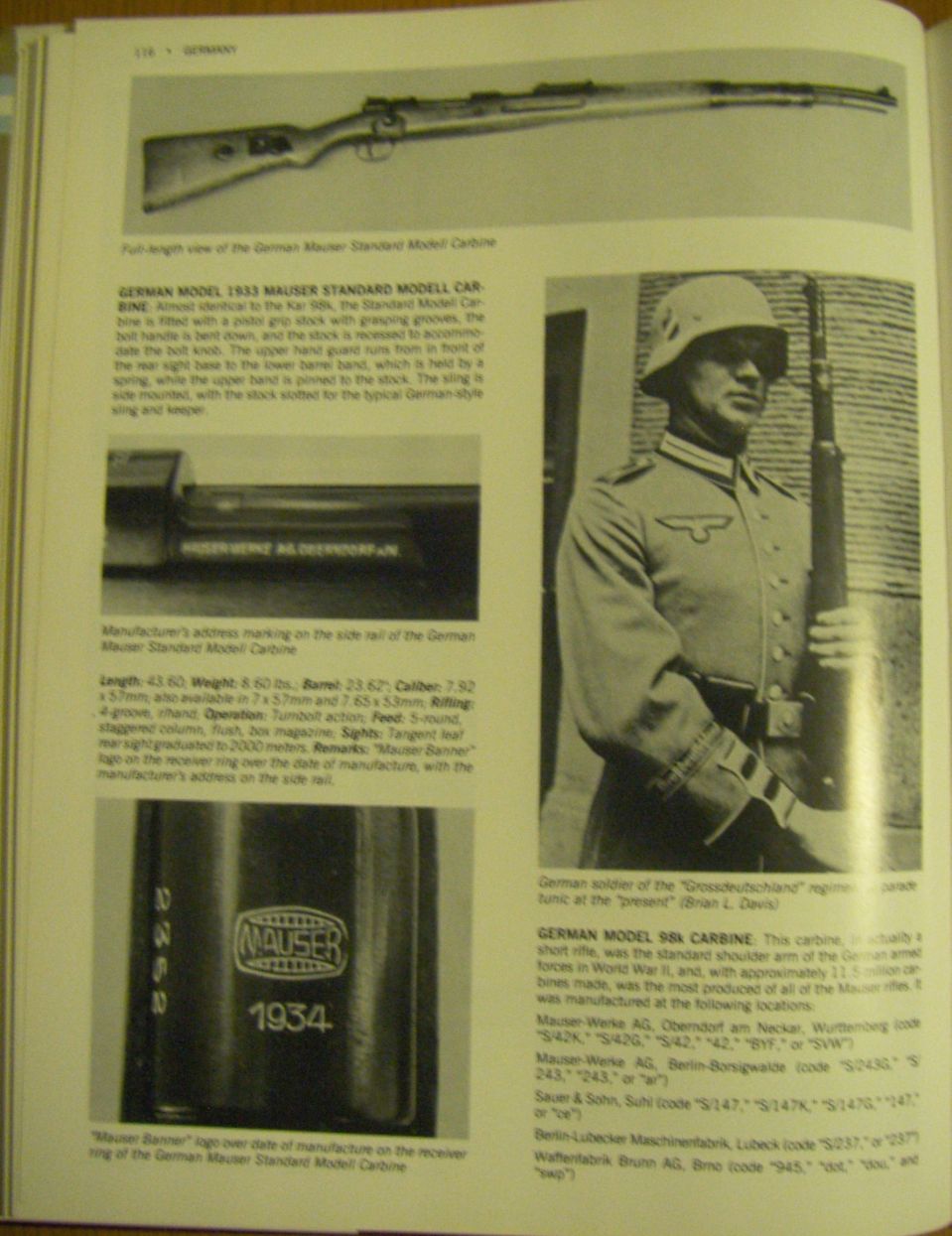 Ragazzi,vi assicuro che questo libro è da urlo!!!Ci sono tutti i modelli di Mauser prodotti dal 1871 al 1945!!!Tutte le nazioni che hanno avuto in dotazione questi fucili,tutte le punzonature ed i marchi!!!In pratica tutto quello che riguarda queste magnifiche armi!!!Questo libro è un regalo del mio Fratello Arditi!!!THANK YOU SO MUCH,BROTHER!!!