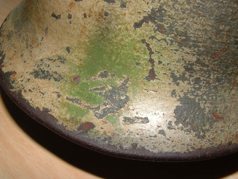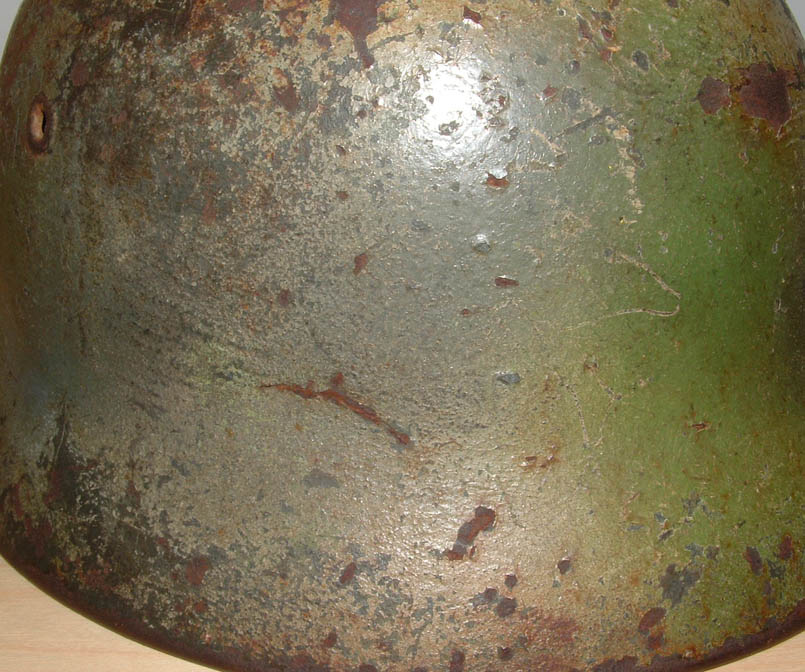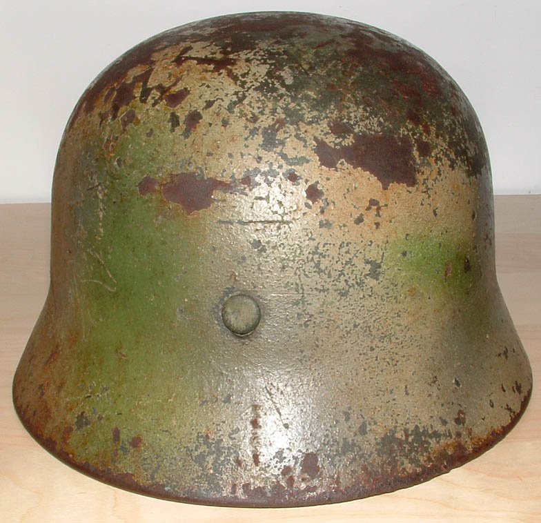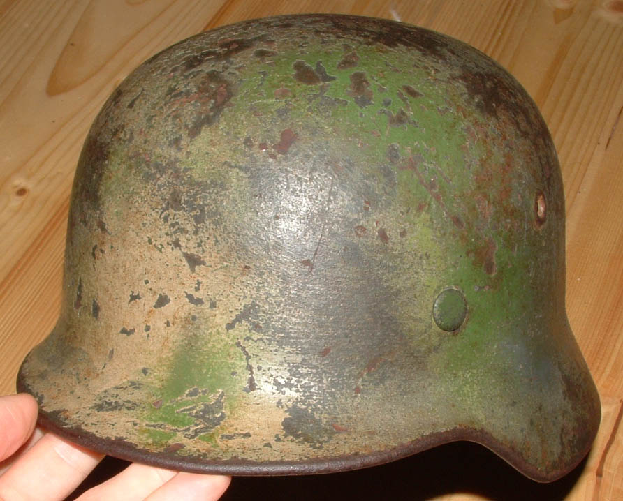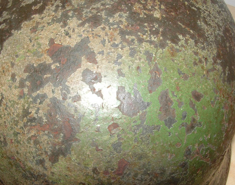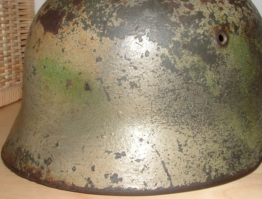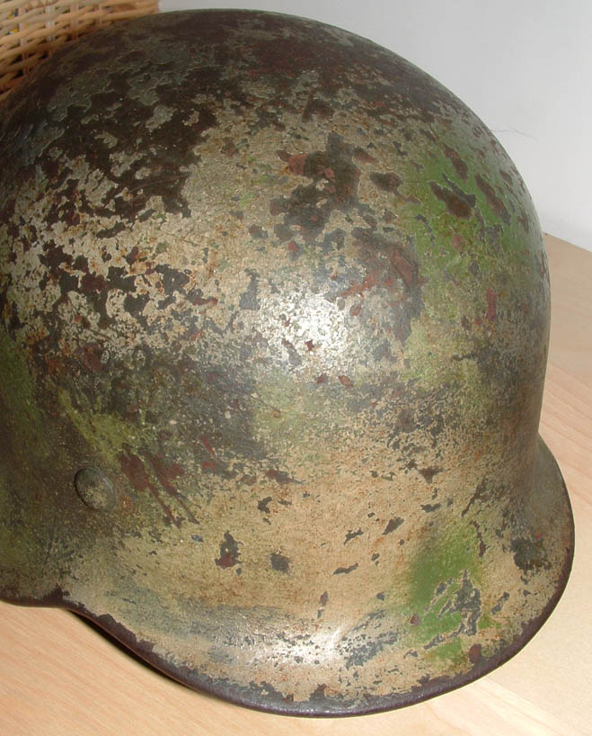 ho preso quest'elmo che a me piace molto,anche perchè ha una storia particolare,ma vorrei sentire dei pareri sul mimetismo che chiaramente io reputo originale, quello che a prima occhiata sembra un due toni in realtà* è un tre toni perchè oltre alla tonalita giallo e verde "cancello o perziana" ci sone delle sfumature realizzate von la classica tonalità* di colorazione flak cioè un gigioblu, l'elmo era già* stato mimetizzato sotto con il verdone a pennello, in queste foto non si vede perchè per il momento vorrei valutare solo la colorazione, è presente anche la decal wh che è sotto la vernice, da quale fronte pensate che provenga???potrebbe essere passato prima per l'afrika????