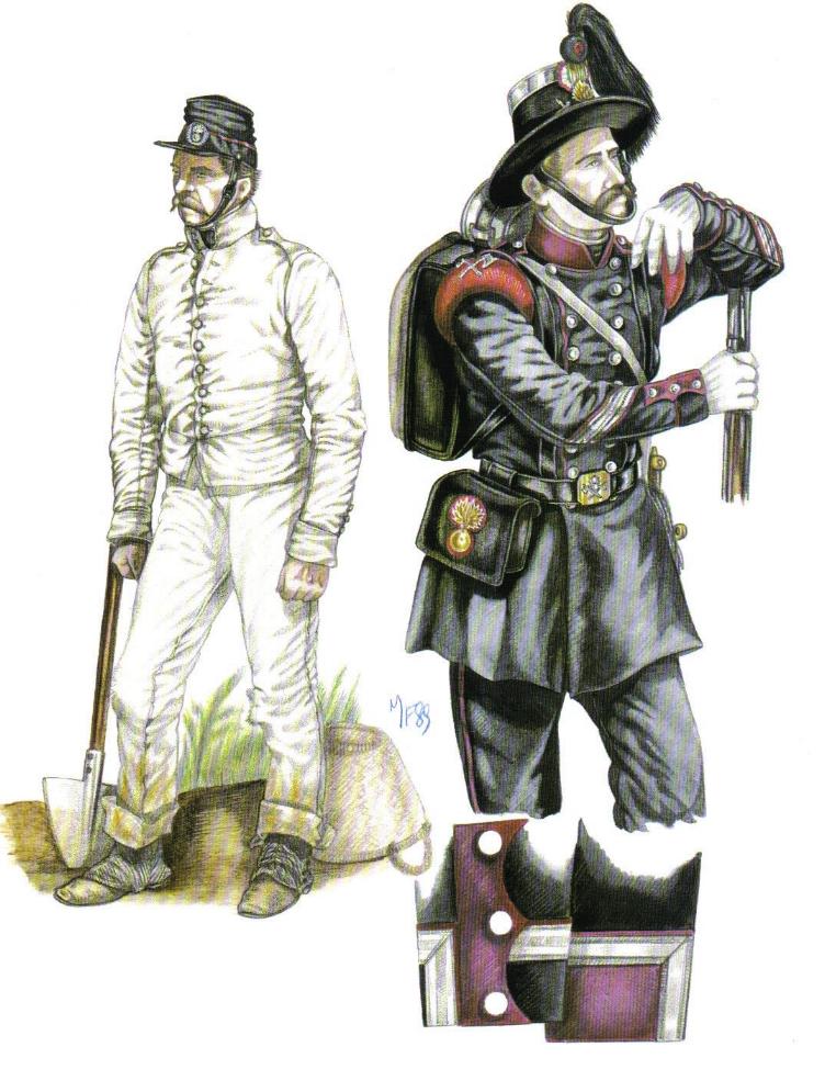 Zappatori del Genio 1848 -1861, a sinistra zappatore in tenuta per i lavori campali 1843-1850. A destra zappatore in gran tenuta 1848-1861. In basso, dettaglio dei distintivi di specialità* per i Minatori ed Artefici di 1^ classe e per MInatori ed Artefici di 2^ classe, sul paramano della tunica che è una mod. 1848: