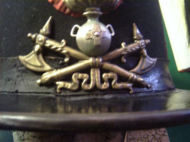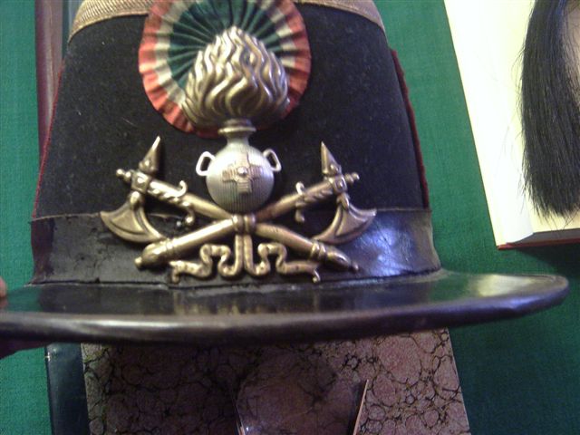 Cappello-Shakot mod.1848 da ufficiale degli zappatori del genio con i distintivi stabiliti nel 1856 per i tenenti. L'esemplare,estremamente raro, rappresenta un tipico esempio di riutilizzo di pezzi diversi: il fusto è quello dello shakot mod.1843, del quale conserva i mascheroni e la catenella soppressi proprio nel 18548, la fakda è stata aggiunta, il fregio è quello con il numero reggimentale stabilito nel 1860: