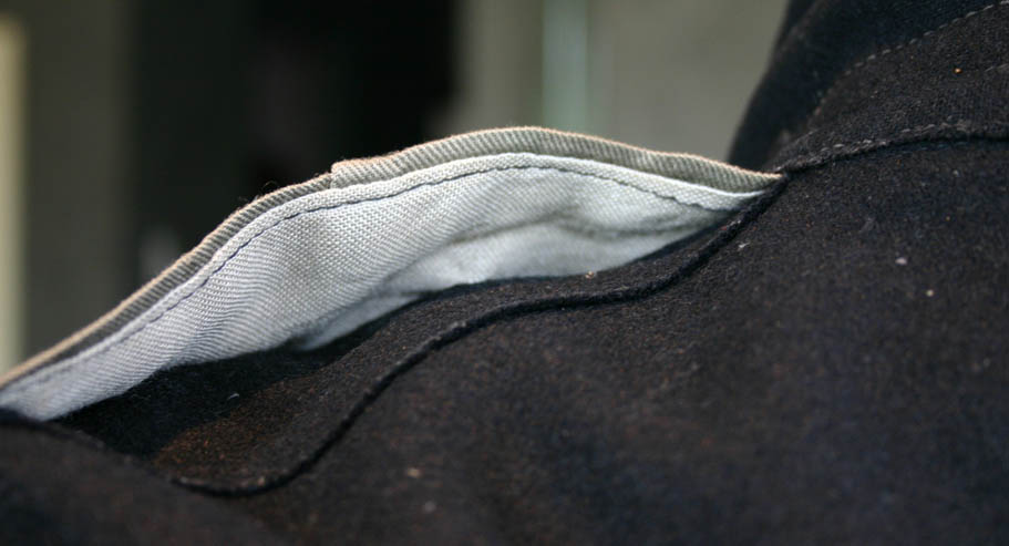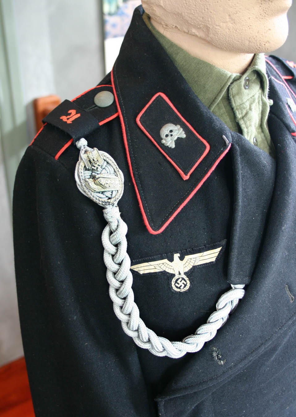 Profilatura al colletto, spalline e mostrine (con Totenkopf con naso a forma di cuore rovesciato) in panno rosa, spalline con "A" gotica in filo rosa per "Panzer-Aufklaerungs", come da regolamento del 25 marzo 1943 (il rosa sostituiva il Waffenfarbe giallo-oro). I passanti sostituivano i numeri/lettere intessuti sulle spalline o le cifre/lettere metalliche per ragioni di sicurezza e economia. L'aquila da petto è intessuta a macchina in filo bianco. Fodera in cotone grigio, qualche riparazione e qualche bottone sostituito, marchi scomparsi. Cordone da tiratore.