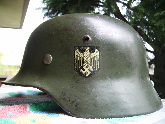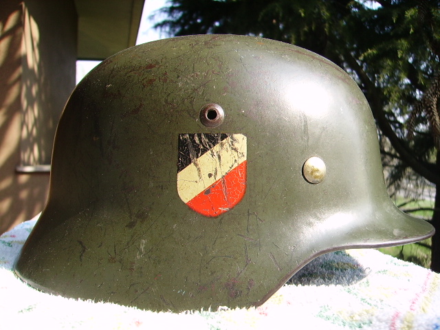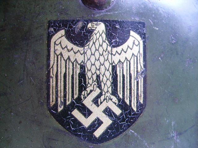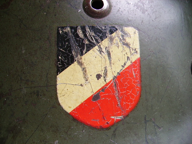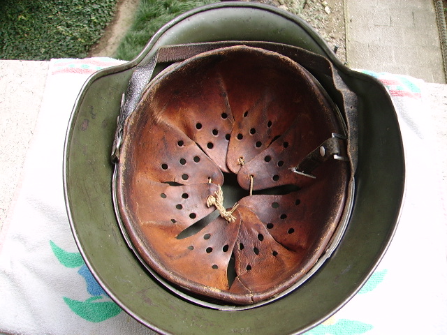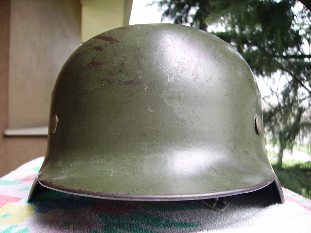 Eccomi qui a condividere con Voi le immagini di un altro biscudo vernice liscia primi tipi colore verde chiaro. E' un ET66 un po vissutello ma ruspante come piace a me. Le decals hanno prodotto le tipiche screpolature che quando sono così accentuate dovrebbero far pensare ad un uso dell'elmo in paesi molto freddi (est, polonia, russia). I rivetti purtroppo hanno perso quasi la totalità* della vernice essendo i primissimi tipi bronzati (poi costruiti in alluminio e infine in acciao zincato).