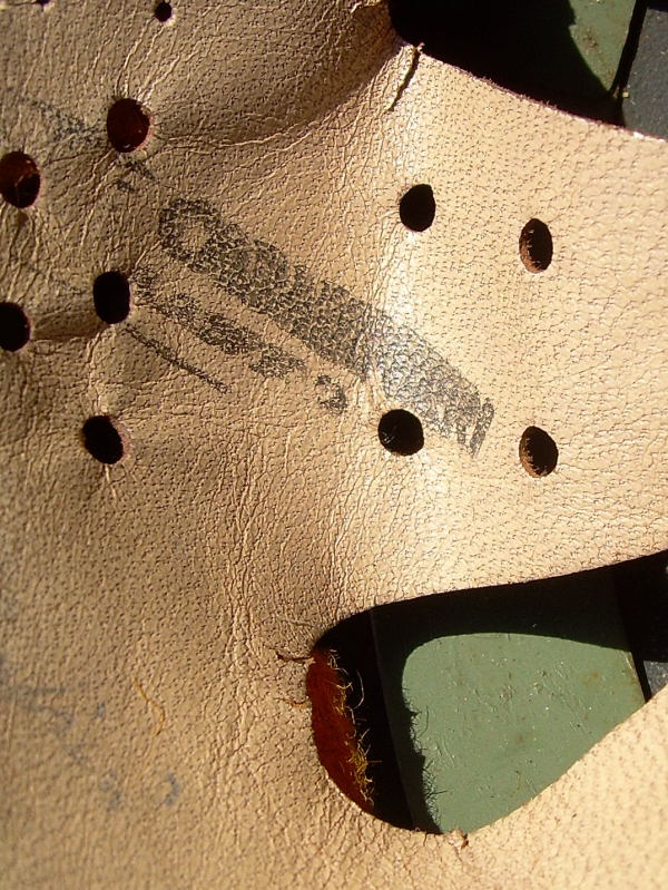 Notare in particolare i rivetti con lo scalino, il cerchio grigio verde, i reggisoggolo non verniciati, indizi di elmetto mai rimaneggiato, il soggolo nero, oltre la pelle chiara e con doppia cucitura parallela.