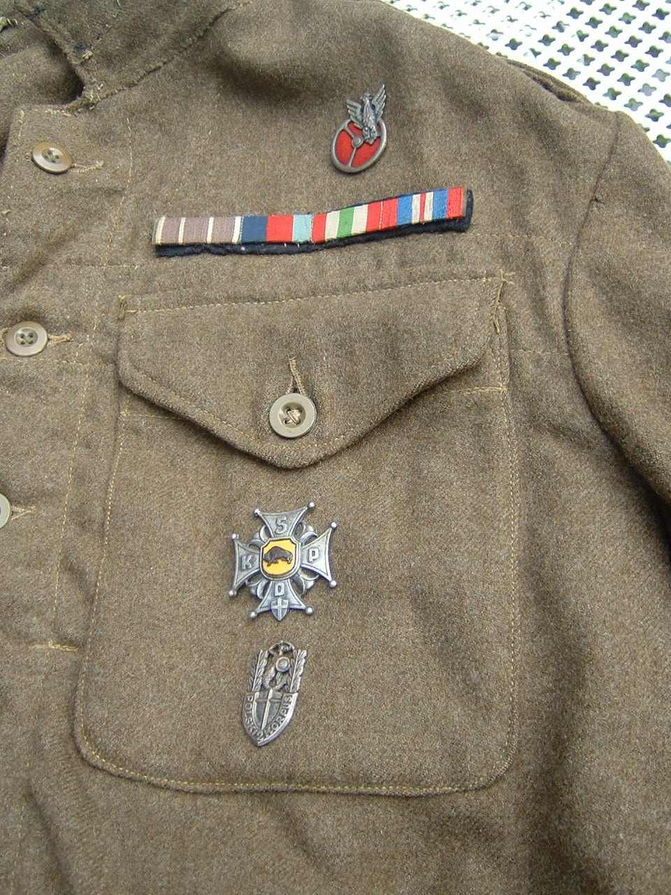 Particolare delle decorazioni. I nastrini sono per la Medal Wojska za Wojne (Medaglia di guerra) polacca, 1939-45 Star Service Medal, Italy star, War Service Medal. I distintivi sono quelli della Sluzba Zaopatrzywania i Transportu, ovvero l'Army Service Corps polacco, della 5 Kresowa Dywizja Piechoty e del II Corpo d'Armata polacco comandato dal generale Anders. Un curiosità*: la zona di arruolamento della Divisione erano i confini orientali della Polonia ("Kresy"), l'unica zona in cui vivano ancora allo stato brado dei bisonti europei ("zubr"), rappresentati sulle insegne divisionali.