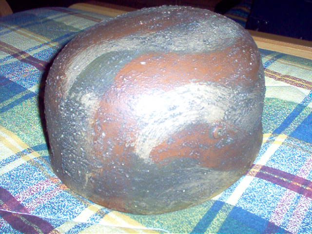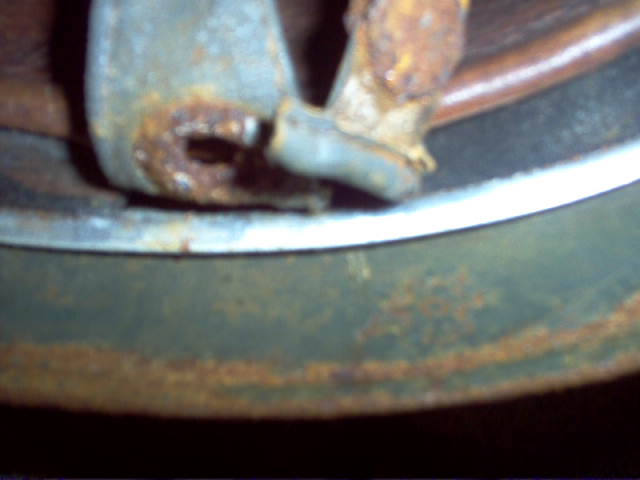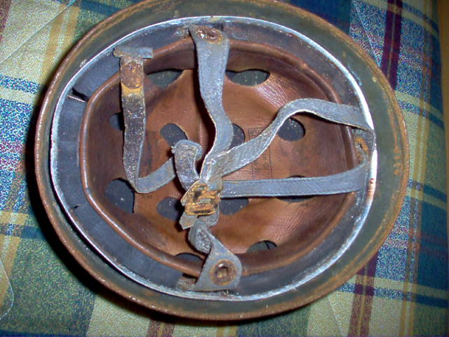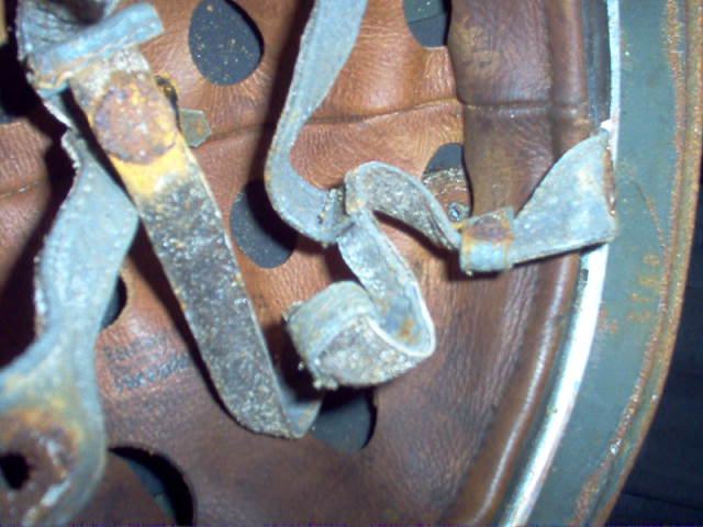 L'interno e l'esterno dell'elmo sembrano non corrispondere affatto. Dal bordo risvoltato emergono forti macchie di ossidazione (ruggine) che non compaiono invece nella parte esterna tra la vernice camo. I rivetti sembrano i primi tipi del m38 parā* ma l'interno di pelle non presenta i tipici punti larghi della cucitura longitudinale. Il sottogola inoltre presenta un altro e diverso grado di conservazione rispetto a tutto il resto. Di quest'ultimo i dettagli non sono visibili ma nell'insieme il mio personale consiglio č di essere mooolto diffidente su questo pezzo ed evitarlo.